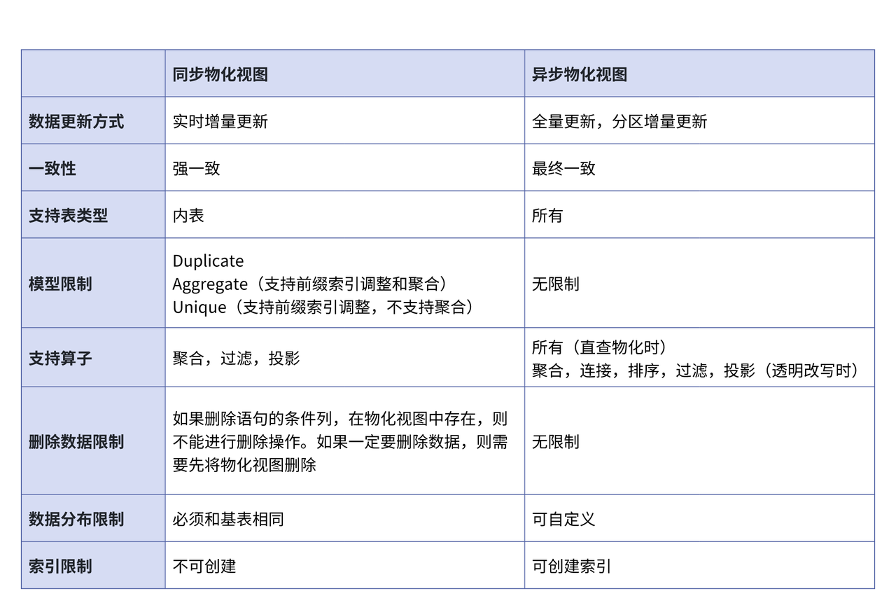 Apache Doris 物化视图进行了支持。早期版本中,Doris 支持同步物化视图;从 2.1 版本开始,正式引入异步物化视图,并在 3.0 版本中完善了这一功能。 正文开始之前,我们先了解同步和异步物化视图的区别: