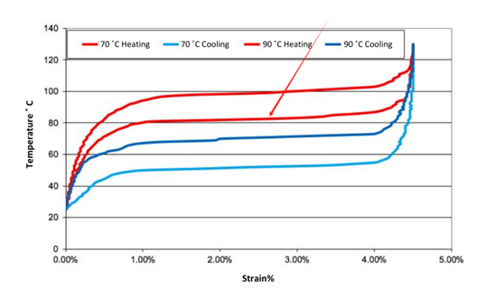 其次是钛丝相变温度偏差:某厂的同一批次钛丝的相变温度偏差,简单点说就是这批次的钛丝表现较低的相变温度和表现较高的相变温度,同样的以M国B厂的这批次钛丝为例(见下图2根红线),较低的相变温度是80度,较高的是100度,那么它的偏差值就是20度。