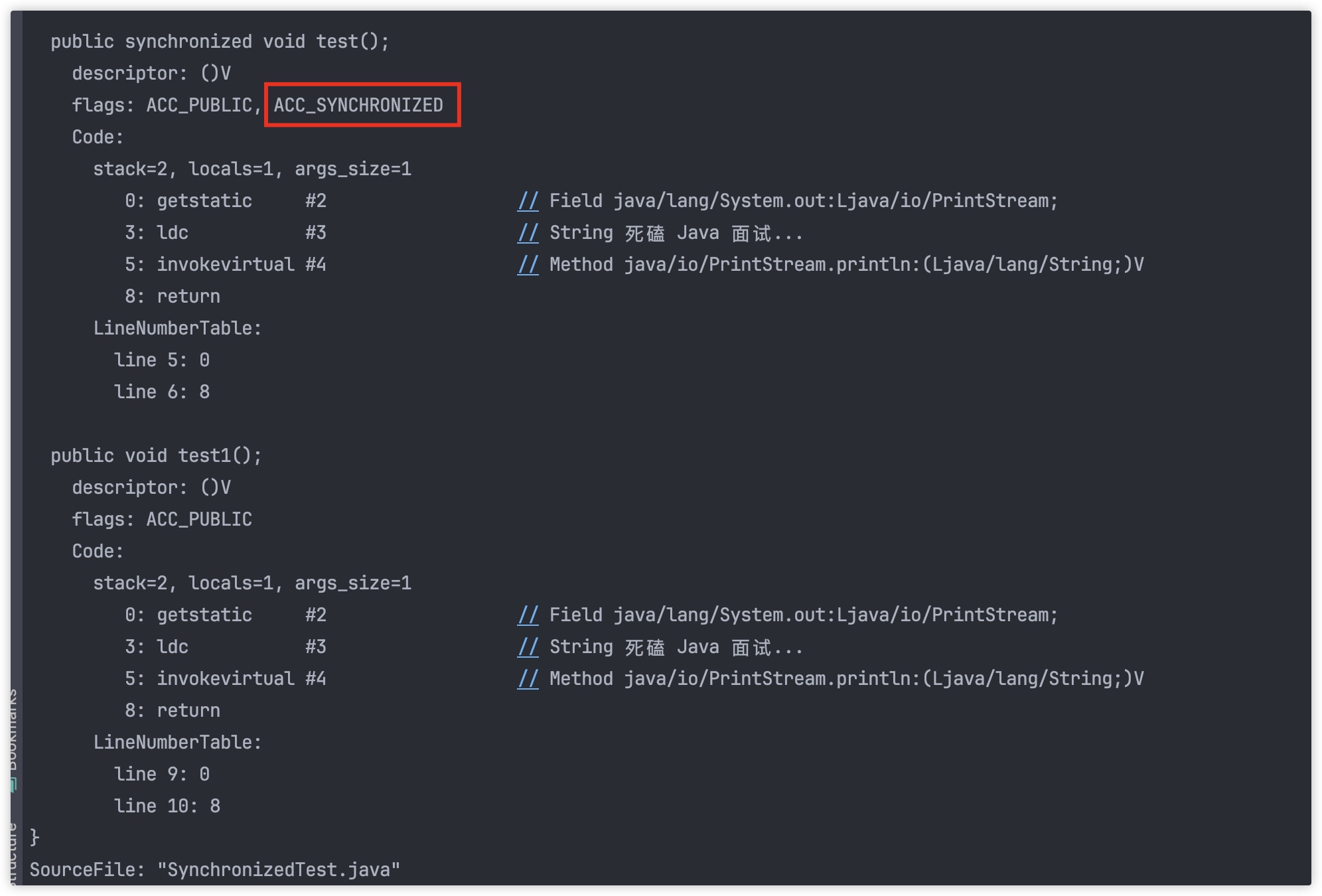 使用 javac SynchronizedTest.java,编译 Java 文件为 .class 文件,然后使用 javap -verbose SynchronizedTest,结果如下: