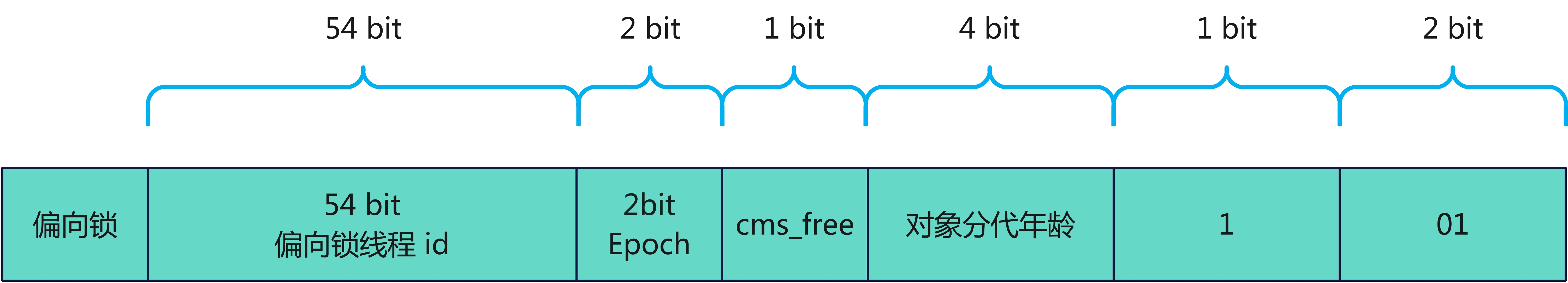 1000001)时,锁就会从无锁状态升级偏向锁。偏向锁会在 Mark Word 中的偏向锁线程 id 存储当前线程的id(1000001),偏向锁标识为 1,锁标识为 01,如下: