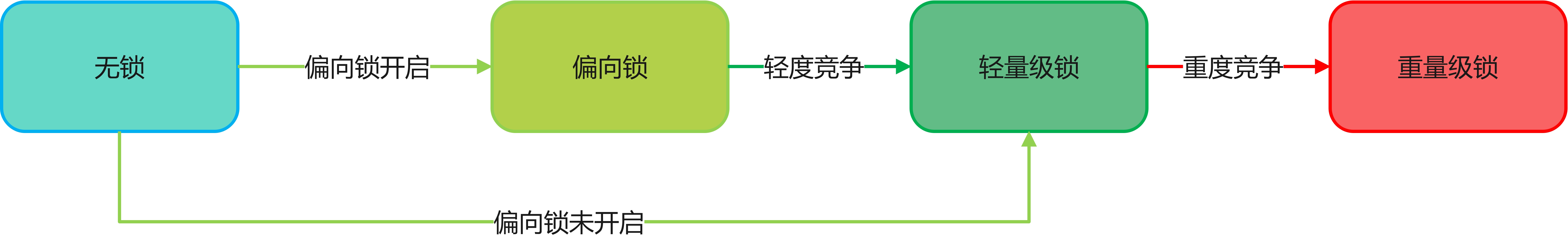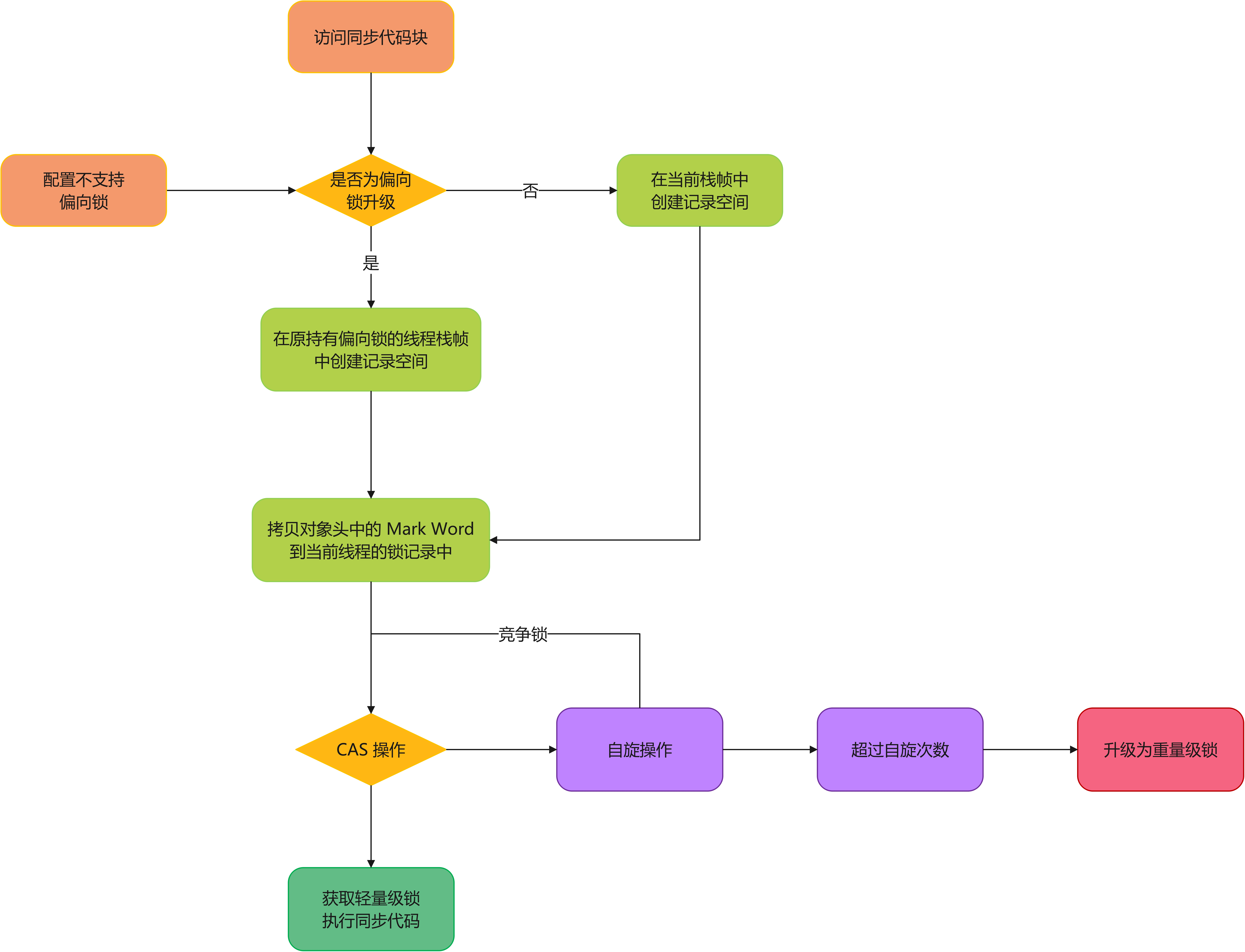 锁升级就是无锁 —> 偏向锁 —> 轻量级锁 —> 重量级锁 的一个过程,注意,锁只能升级,不能降级。流程图如下: