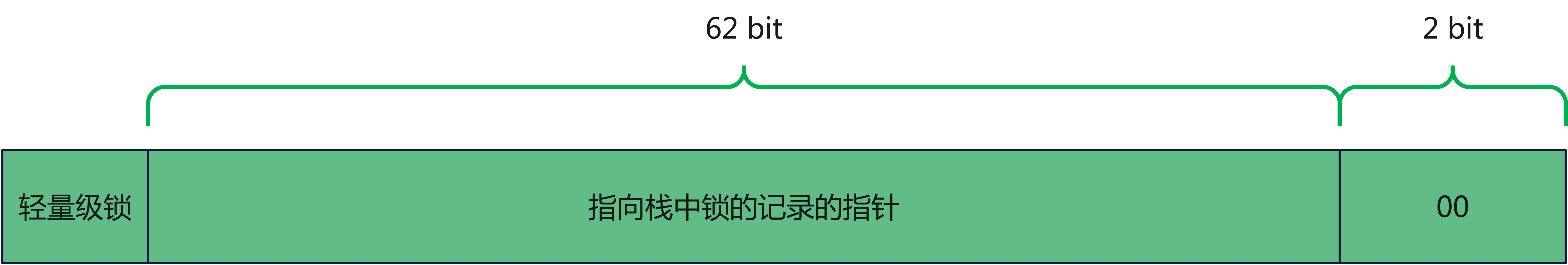 Lock Record),用于存放锁对象目前的 Mark Word 的拷贝,然后拷贝对象头中的 Mark Word 到线程 A 的锁记录中(官方称之为 Displaced Mark Word ),若拷贝成功,JVM 将使用 CAS 尝试将对象头重的 Mark Word 更新为指向线程 A 的Lock Record的指针,成功,线程 A 获取轻量级锁,此时 Mark Word 的锁标志位为 00,指向锁记录的指针指向线程 A 的锁记录地址,如下图:
