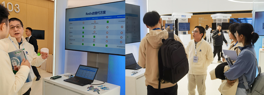 图:华为云DCS专家在Valkey展位前为参会者讲解,吸引了众多业内人士和技术爱好者的关注。