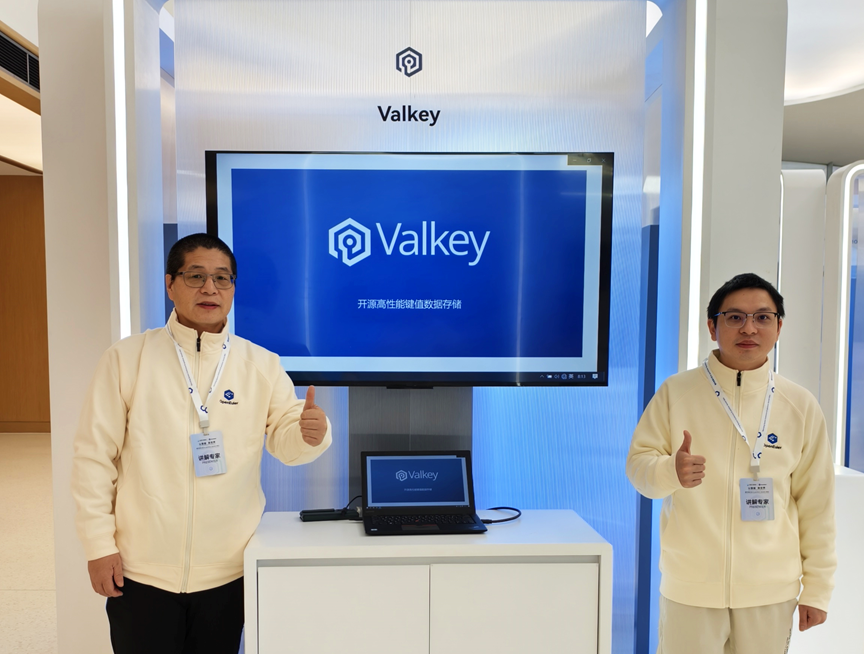 图:华为云DCS两位专家在Valkey展台前合影;华为云中间件存储技术专家(左);华为云分布式缓存高级工程师(右)