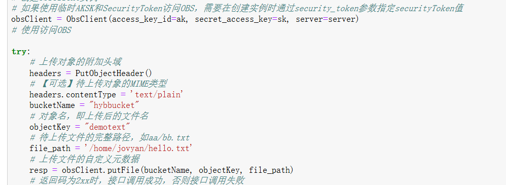 通过OBSClient,传入ak,sk,server的值,与客户端建立连接。我们上传的是txt文件,所以contentType='text/plain',buckName是我们在OBS已存在桶名