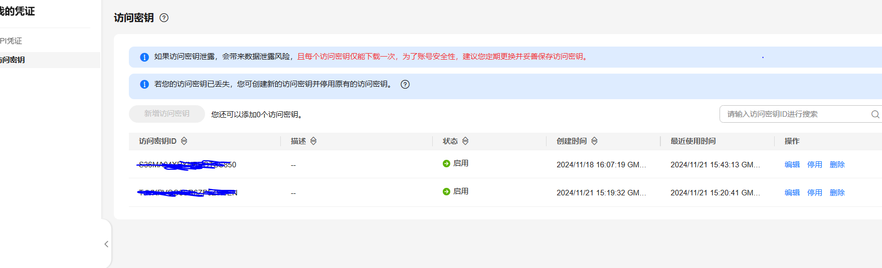 首先我们需要从华为云官网我的凭证里面新建访问密钥,获取AK与SK