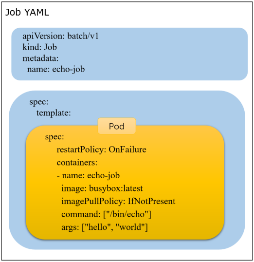为了辅助你理解,我把 Job 对象重新组织了一下,用不同的颜色来区分字段,这样你就能够很容易看出来,其实这个“echo-job”里并没有太多额外的功能,只是把 Pod 做了个简单的包装: