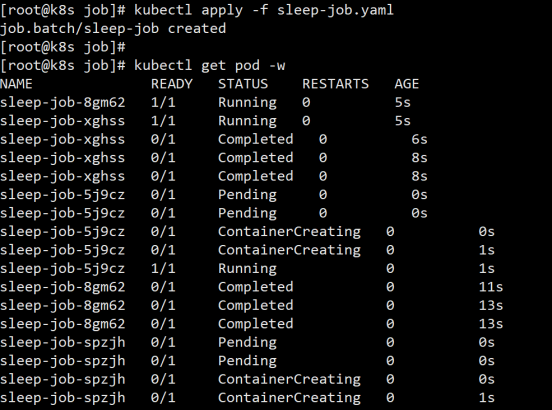 使用 kubectl apply 创建 Job 之后,我们可以用 kubectl get pod -w 来实时观察 Pod 的状态,看到 Pod 不断被排队、创建、运行的过程: