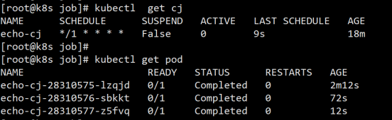 除了名字不同,CronJob Job 的用法几乎是一样的,使用 kubectl apply 创建 CronJob,使用 kubectl get cjkubectl get pod 来查看状态: