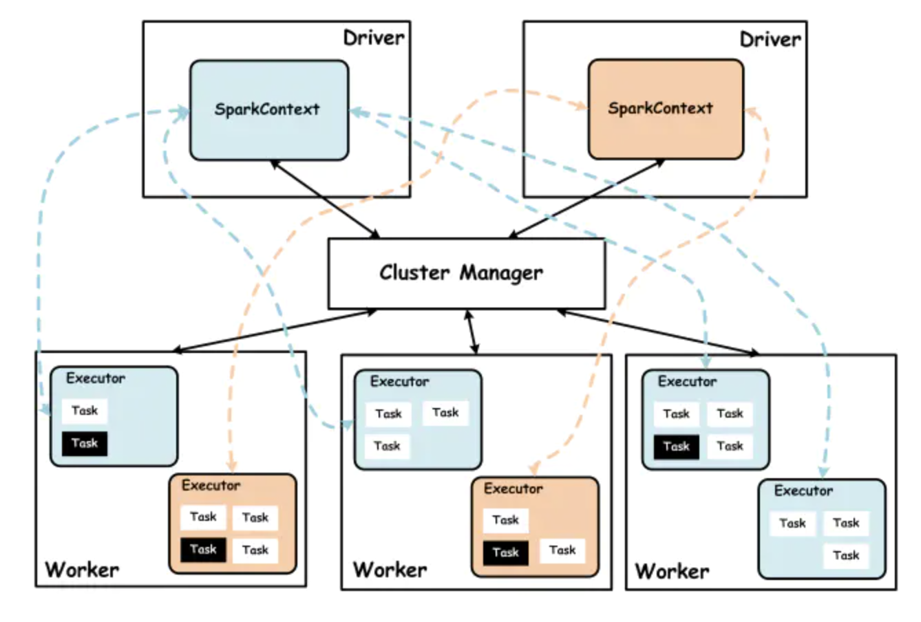Spark 集群由集群管理器 Cluster Manager、工作节点 Worker、执行器 Executor、驱动器 Driver、应用程序 Application 等部分组成。具体关系如下图: