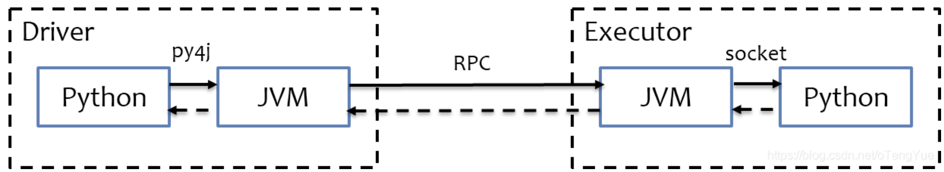 在Executor端,spark也执行在JVA,task任务已经是序列后的字节码,不需要用py4j了,但是如果里面包含一些python库函数,JVM无法处理这些python函数,所以会需要为每个task启动一个python进程,通过socket通信将python函数在python进程中执行后返回结果。