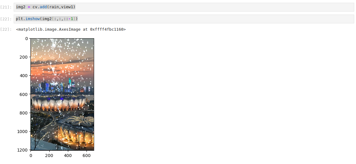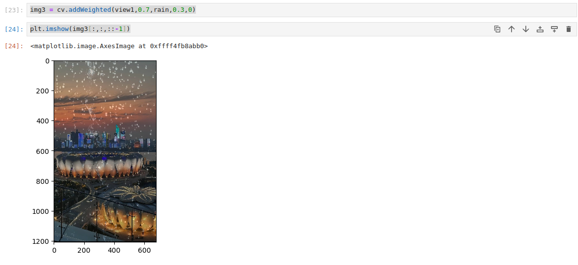 img3 = cv.addWeighted(view1,0.7,rain,0.3,0) #cv.addWeighted() 是 OpenCV 中用于图像混合的一个函数,它可以根据给定的权重将两个图像融合到一个输出图像中。