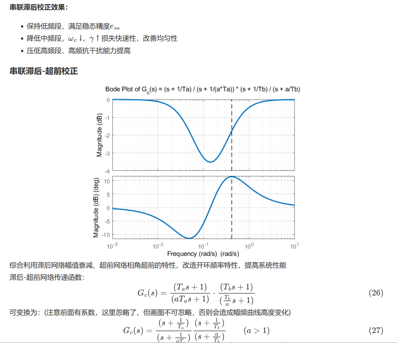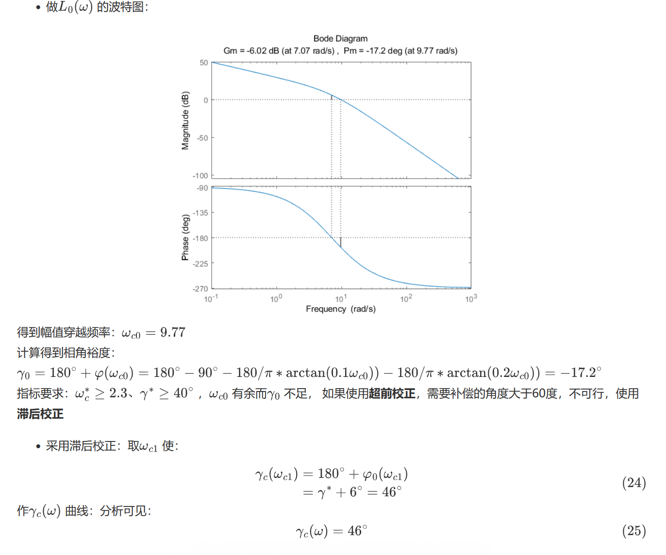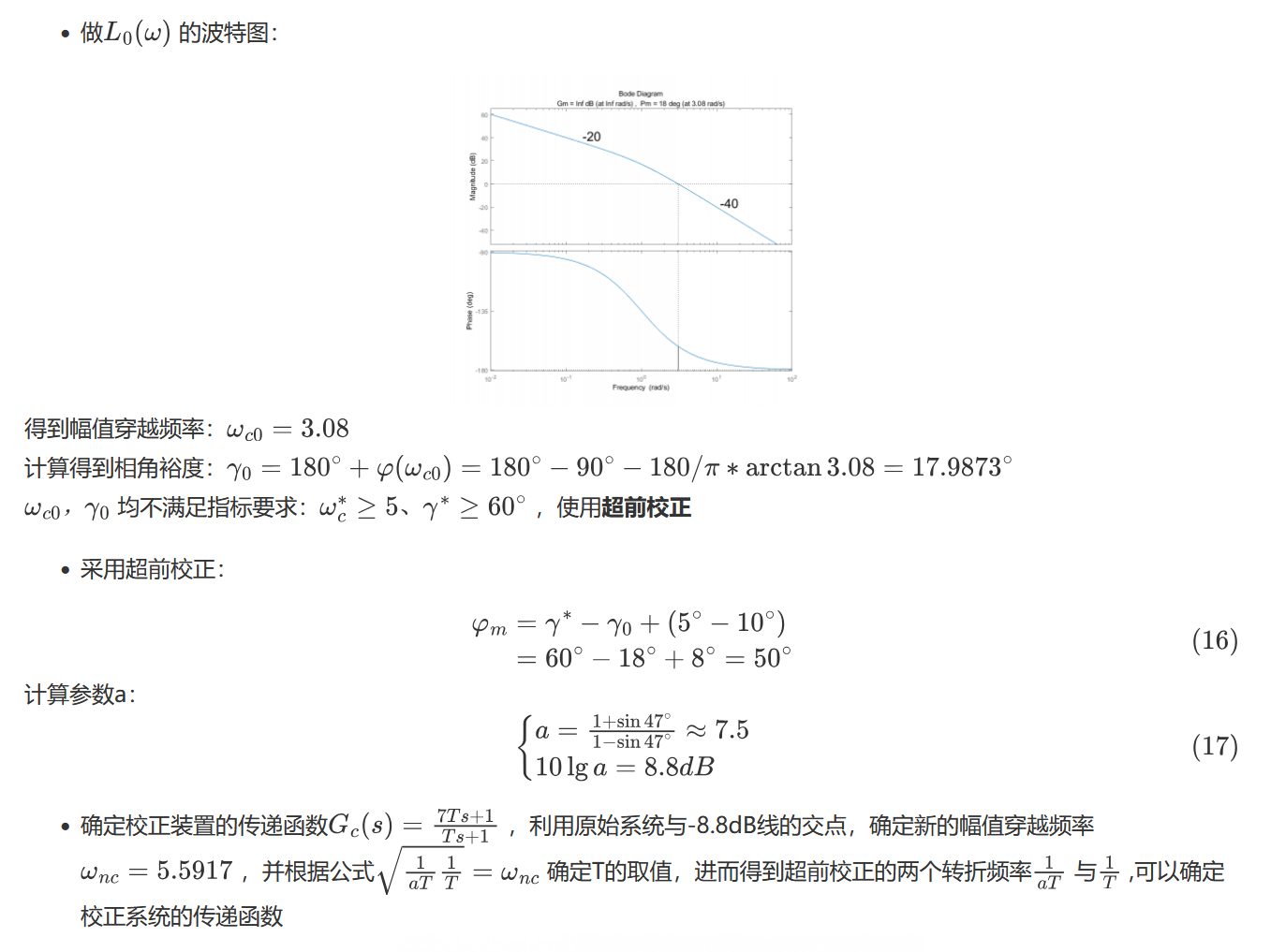 波特图可以指导控制器的设计。通过调整控制器的参数,可以改变系统的频率响应,以满足特定的性能要求。波特图提供了反馈信息,帮助选择合适的控制器类型和参数,以达到期望的控制效果。本文使用串联超前校正、串联滞后校正、滞后-超前校正及PID校正,进行控制器的设计。