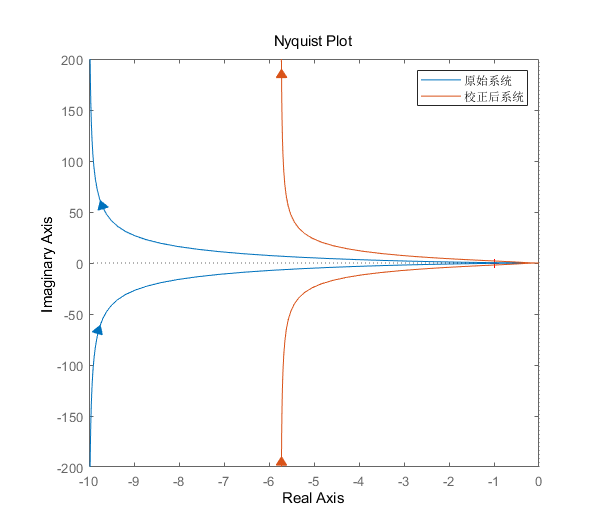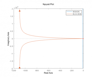 校正前后的nyquist曲线如下图,相角裕度变大,幅值裕度为infdB,满足指标要求。