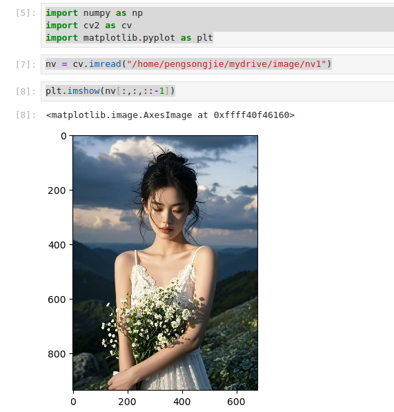 nv = cv.imread("/home/pengsongjie/mydrive/image/nv1") #先载入图像,原始图像是(935*678)