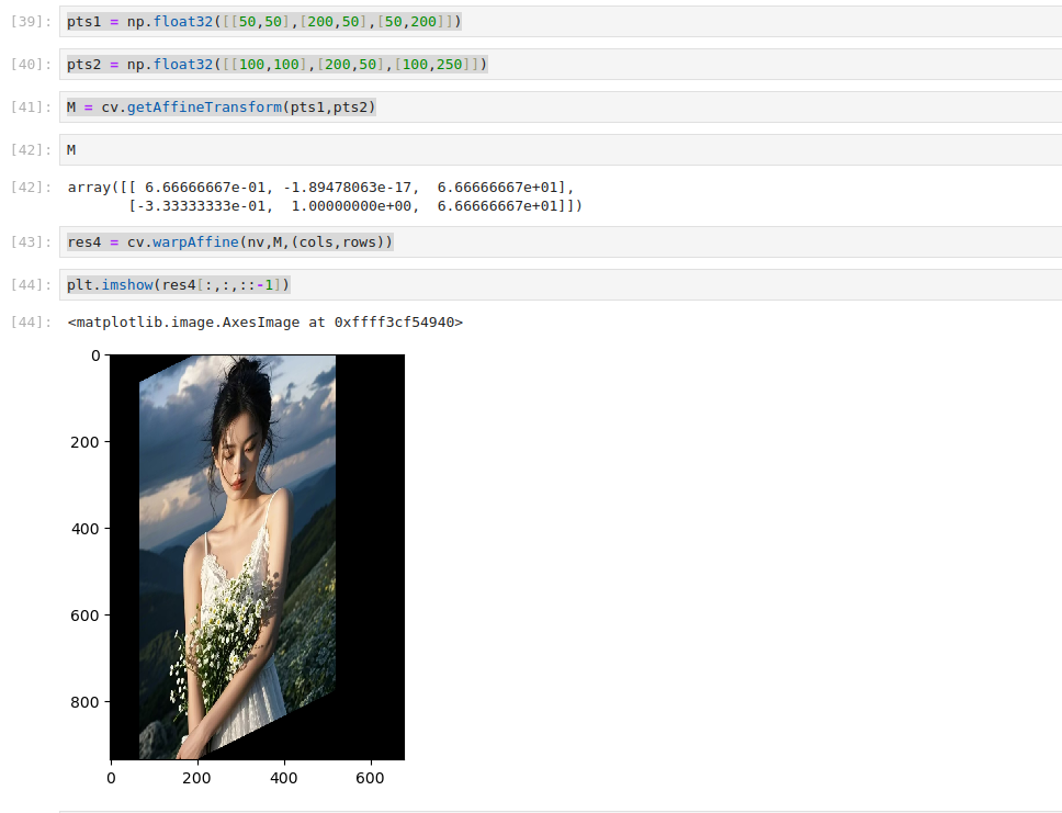 4、仿射变换:调用cv.getAffineTransform创建变换矩阵,然后调用cv.warpAffine()平移图像