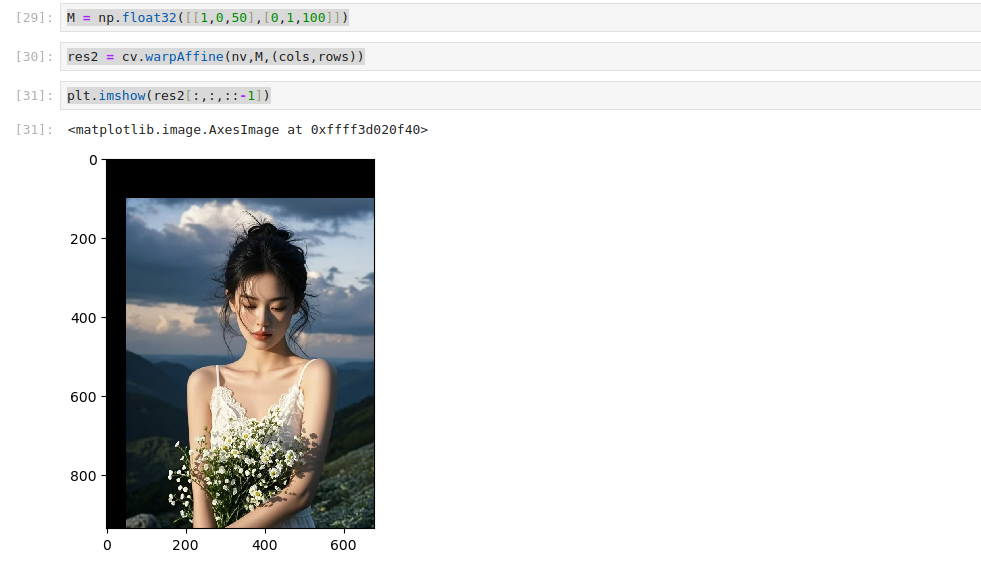 M = np.float32([[1,0,50],[0,1,100]]) #这行代码创建了一个 2x3 的 NumPy 数组,并且将数组中的所有元素转换为 float32 类型。这个数组 M 通常用作仿射变换矩阵