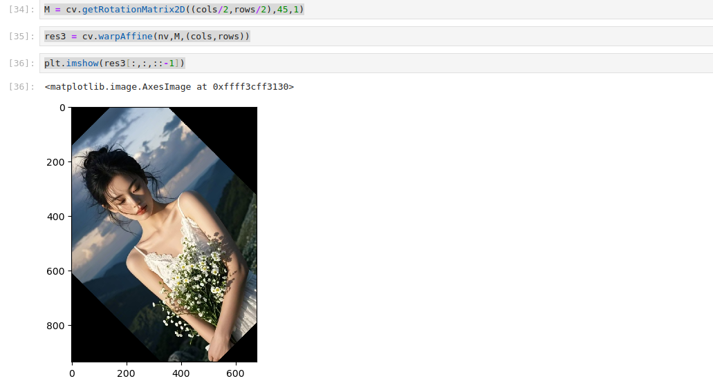 3、图像旋转:调用cv.getRotationMatrix2D获取旋转矩阵,然后调用cv.warpAffine()进行旋转