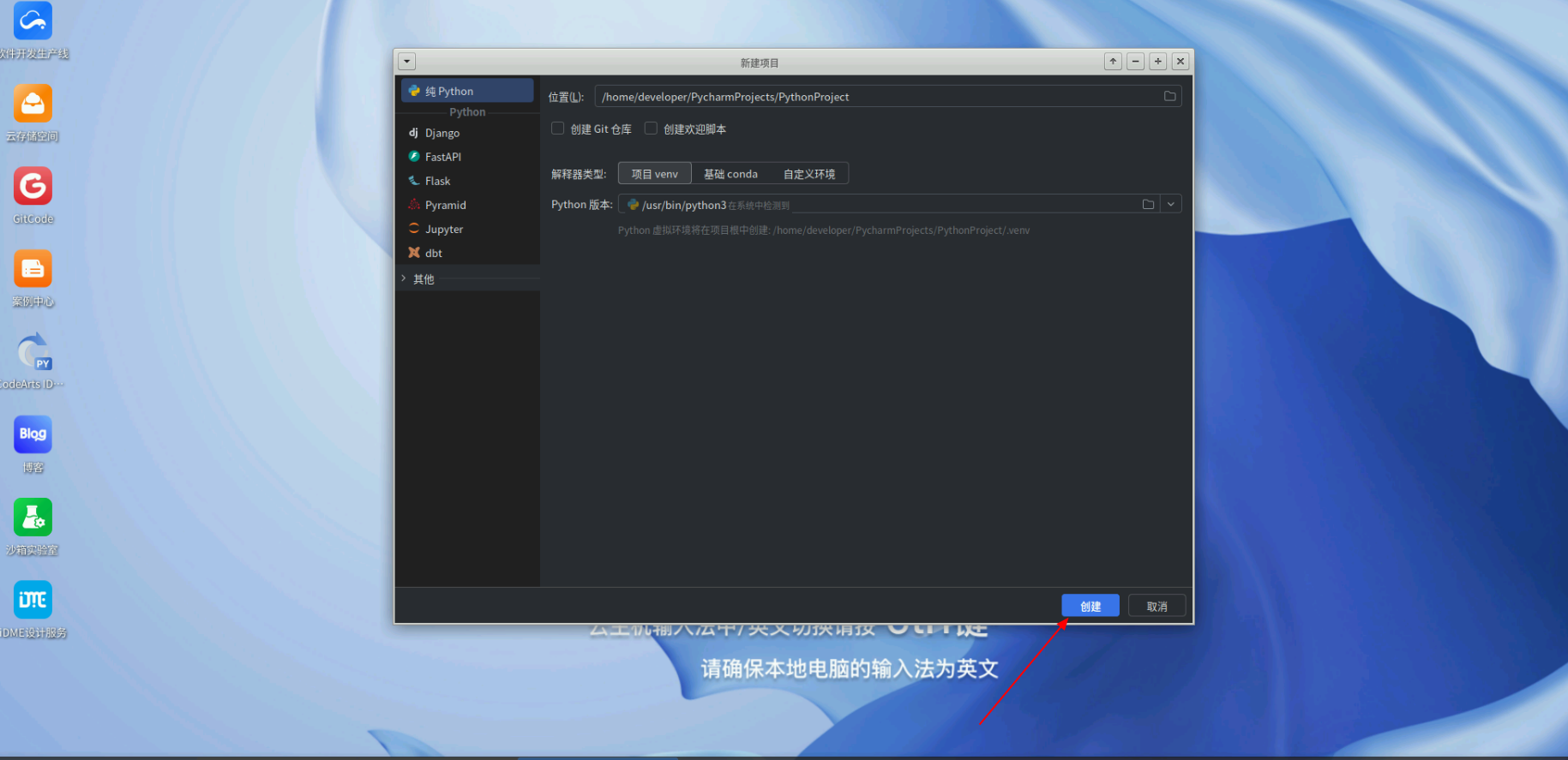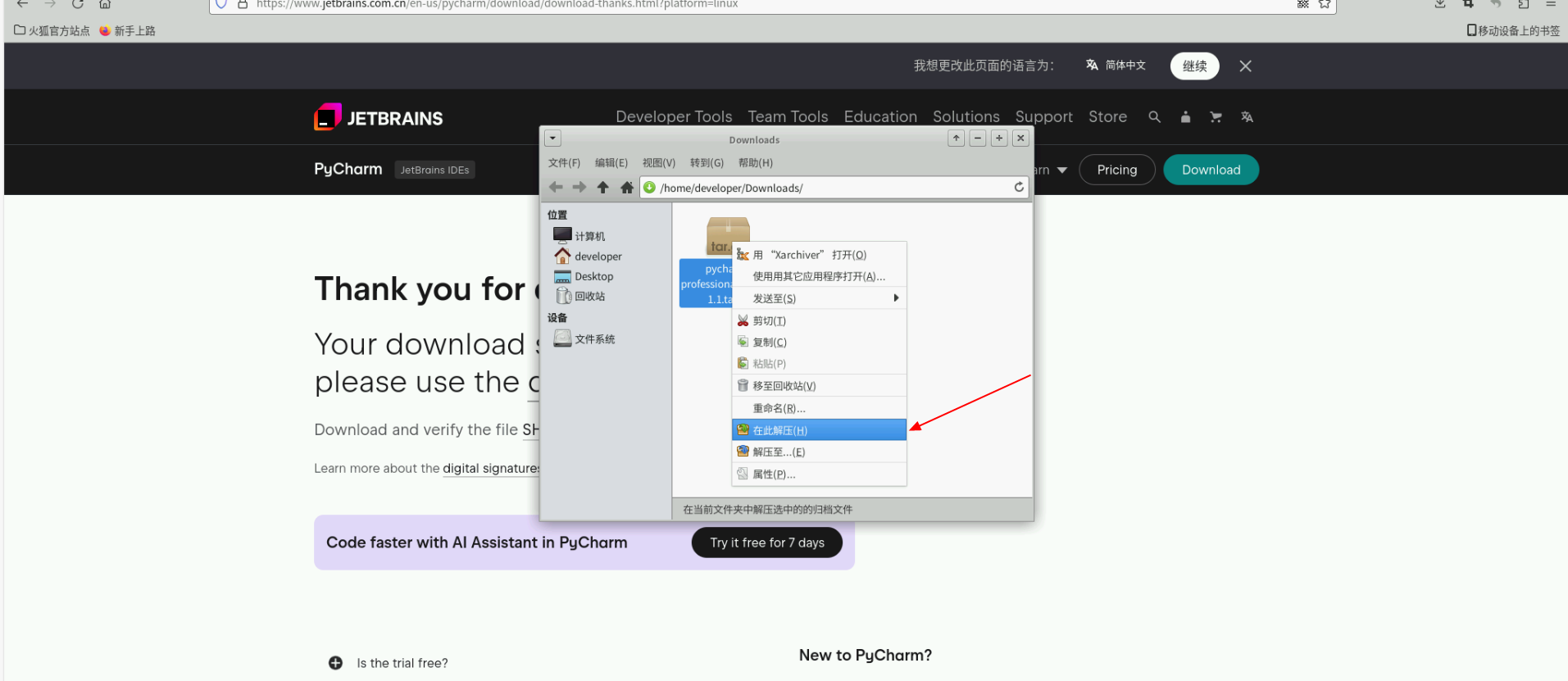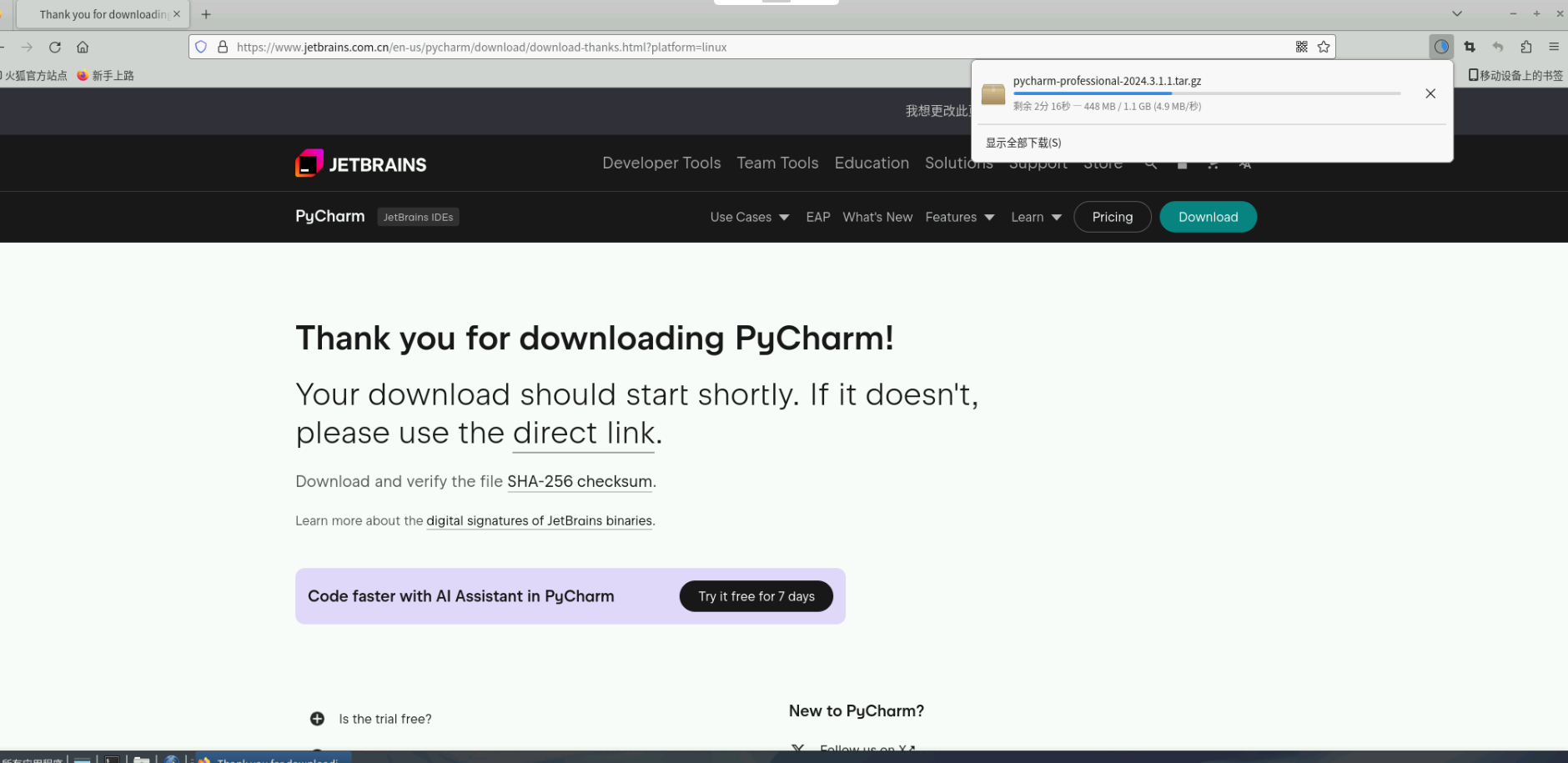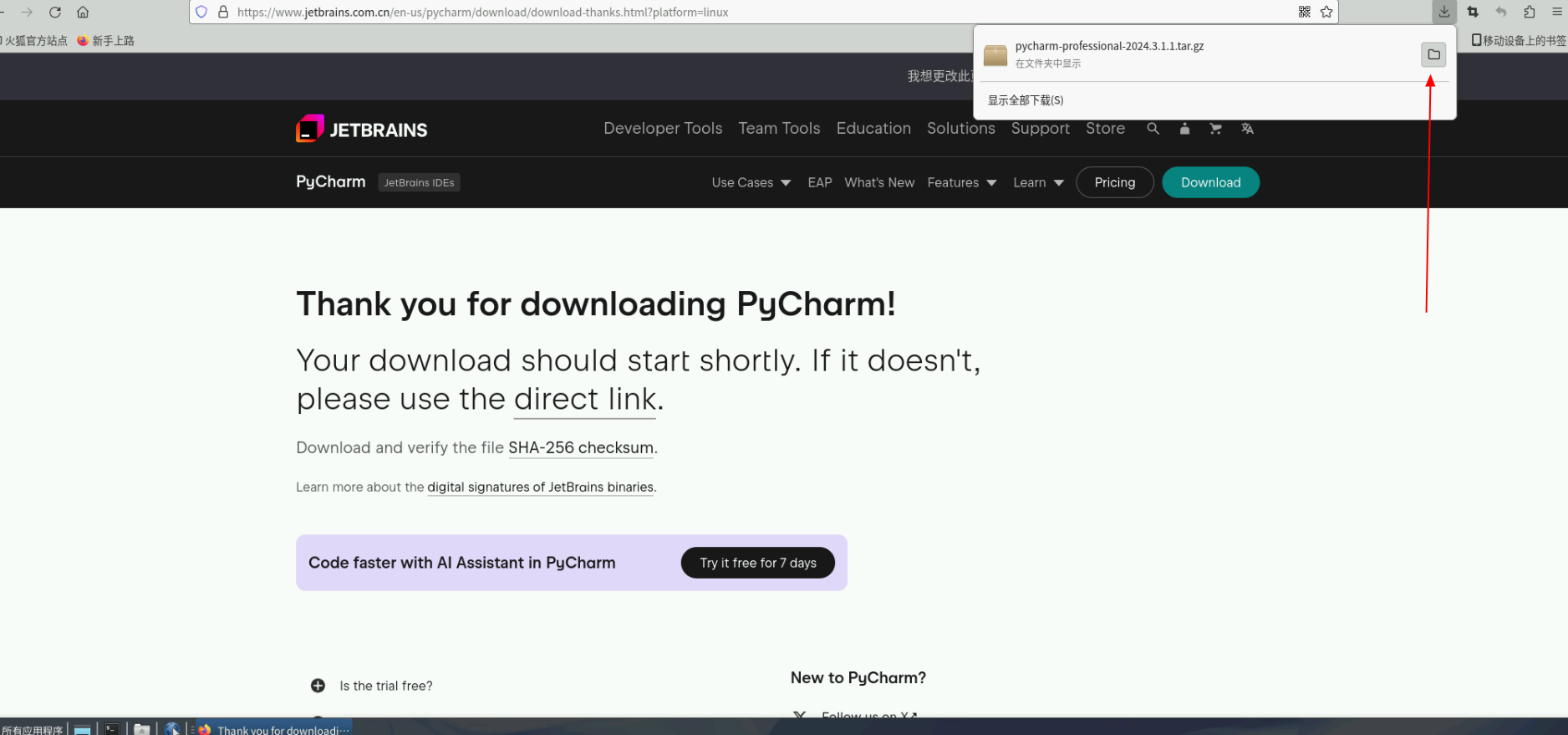 进入云主机,打开左侧Firefox浏览器,将https://www.jetbrains.com.cn/en-us/pycharm/download/download-thanks.html?platform=linux