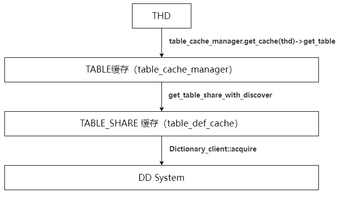 会话通过THD ID和表名到table_cache_manager中去获取TABLE对象和TABLE_SHARE对象。如果从table_cache_manager找不到可用的TABLE_SHARE对象,就会从table_def_cache中获取。如果从table_def_cache中找不到TABLE_SHARE,就会从DD中读取表定义信息来构建TABLE_SHARE对象。