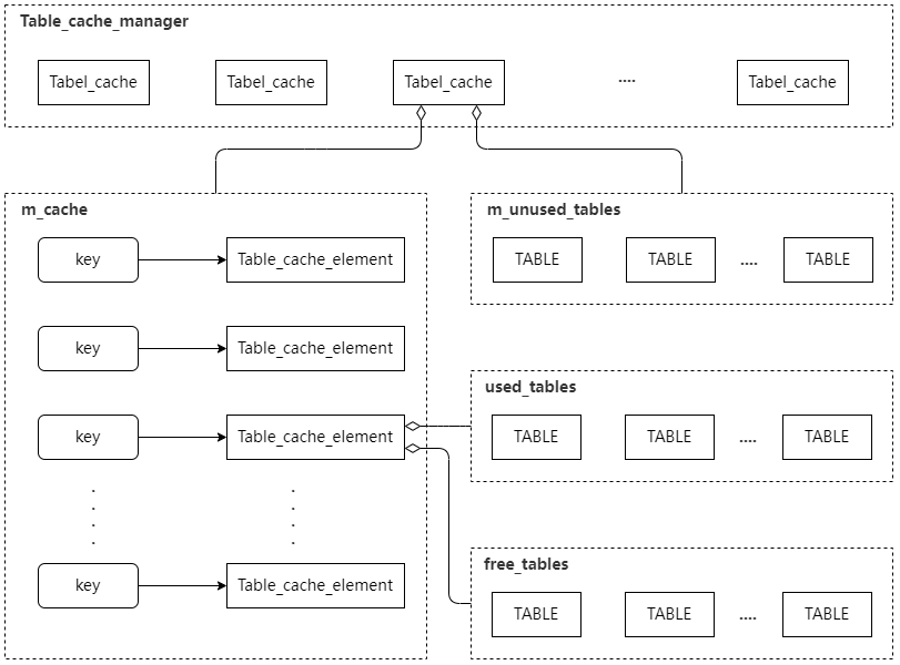 • 在Table_cache中,m_unused_table缓存了所有处于空闲状态的TABLE对象,m_cache 是按照 [key:"database_name + table_name", value:Table_cache_element ] 建立的哈希表,每个Table_cache_element都唯一对应于一个TABLE_SHARE,并负责独立管理该TABLE_SHARE下所有正在使用和空闲的TABLE对象。由于Table_cache是按照 thread_id 进行分片的,因此,同一个TABLE_SHARE可能会分布在多个 Table_cache 的 Table_cache_element 中。