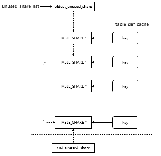 TABLE_SHARE缓存由哈希表(table_def_cache)和未使用对象链表(oldest_unused_share)组成。哈希表以表名为键,缓存了TABLE_SHARE对象;而未被使用的TABLE_SHARE对象则通过oldest_unused_share链表进行链接。
