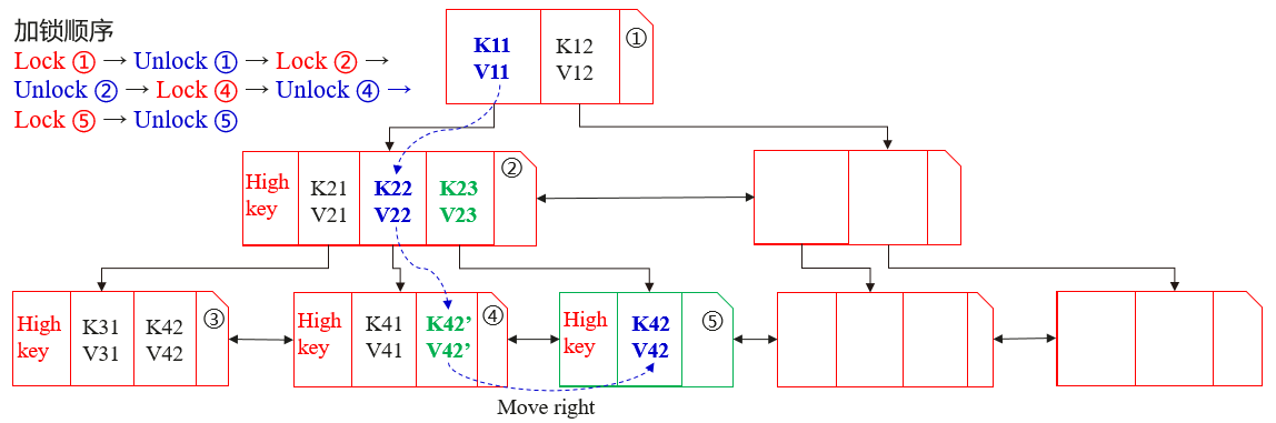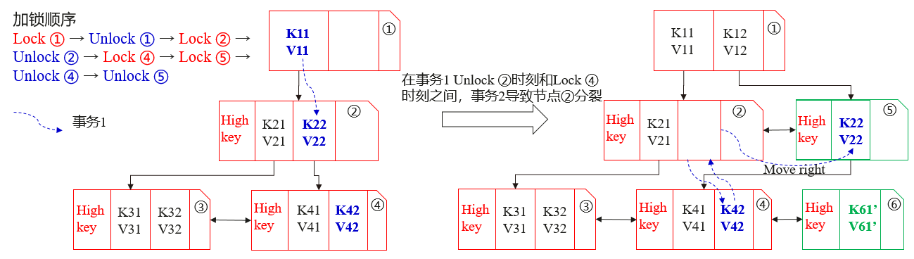 这主要是因为,一个事务在查询时,可能会有另外一个事务导致索引的节点分裂,进而导致从根节点到叶子节点的遍历过程中,如果先释放父节点的锁,再获取子节点的锁,可能会在持有子节点锁的时刻,目标元组<K, V>已经转移到了新分裂的节点。这时候需要有某种机制,可以快速地识别到这种情况,并且可以定位到目标<K, V>所在的节点,而Blink Tree的特殊结构可以比较简单地实现这种机制。