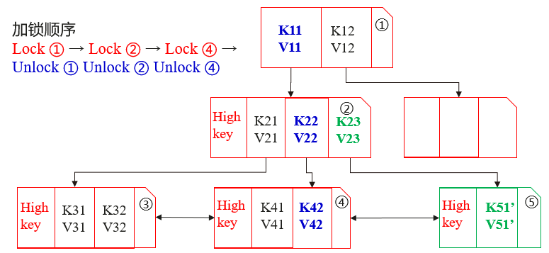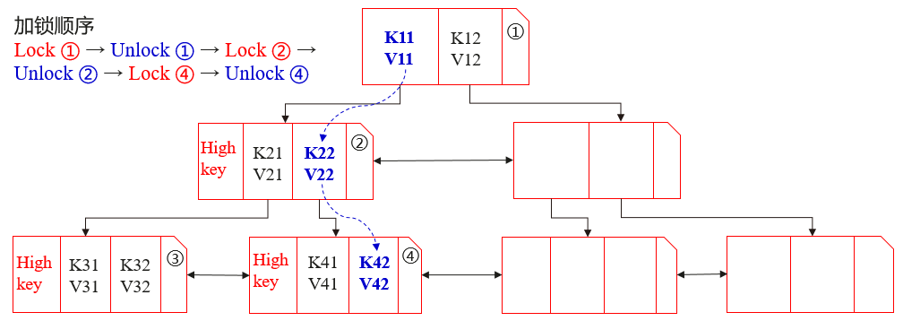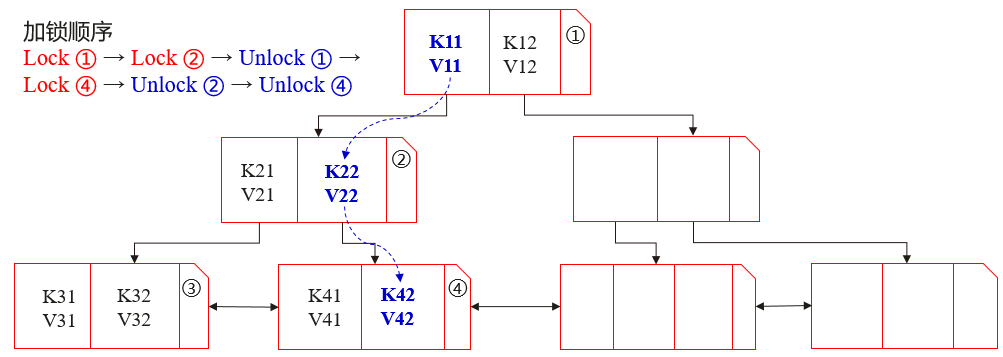 首先,查询事务会锁住根节点①,然后,利用二分查找找到<K11, V11>。接着,事务会先释放节点①的锁,再锁住节点②,再利用二分查找找到<K22, V22>。紧接着,事务会先释放节点②的锁,再锁住节点④,最后通过二分查找找到目标值<K42, V42>后,再释放节点④的锁。
