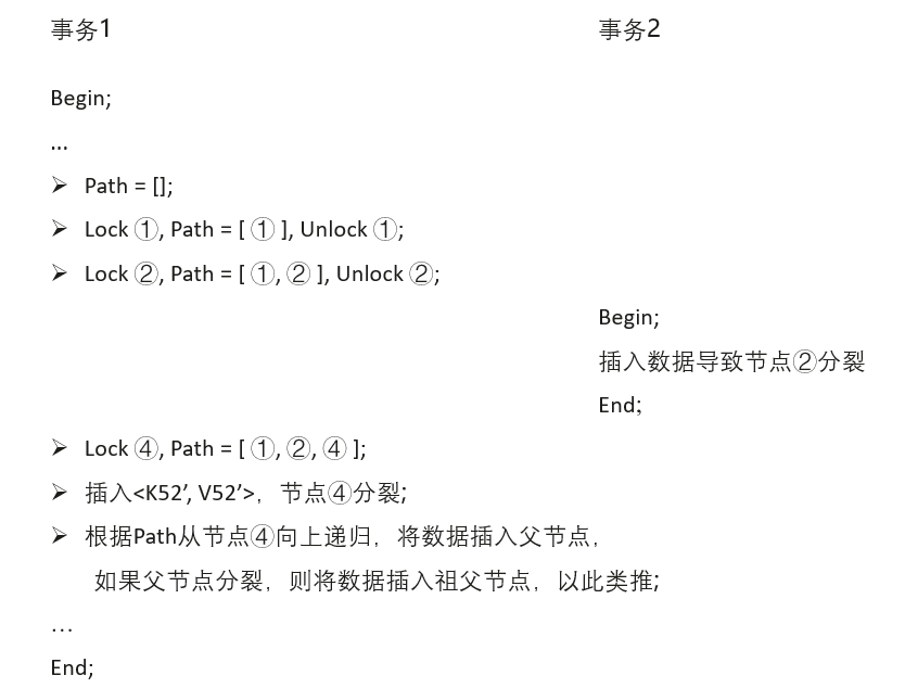 更直观地,以图4的例子来说,当查询事务在执行到Unlock ②与Lock ④之间的时间段时,如果有另外一个写事务插入了数据<K42’, V42’>,这将导致节点④发生了分裂,从而使得目标元组<K42, V42>转移到了新分裂的节点⑤中。