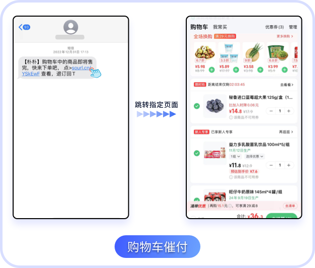 例如以下新零售电商朴朴超市在用户加购后半小时未完成结算,便通过短信话术“商品即将售罄”催促用户清空购物车,用户通过Deeplink起到超链接效果,直接进入购物车页面支付,大大缩减了整体购买路径,促进了支付转化率。