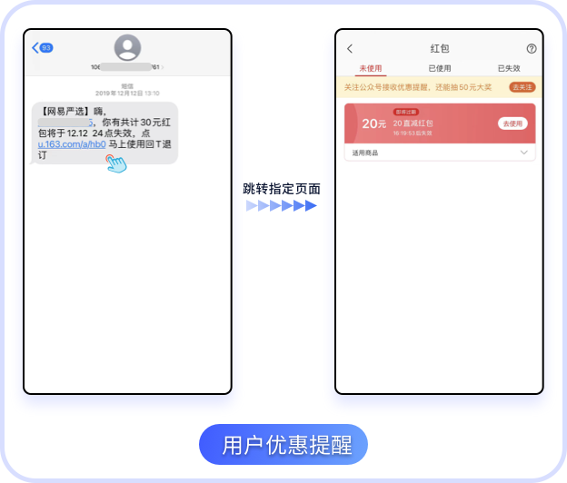例如以下网易严选App在用户下载注册后已经赠送了新人购物券,在被用户忽略后,通过带有Deeplink链接的短信提醒强化用户欲望,点击就能直达优惠券页面,省去了用户寻找优惠券入口的成本。