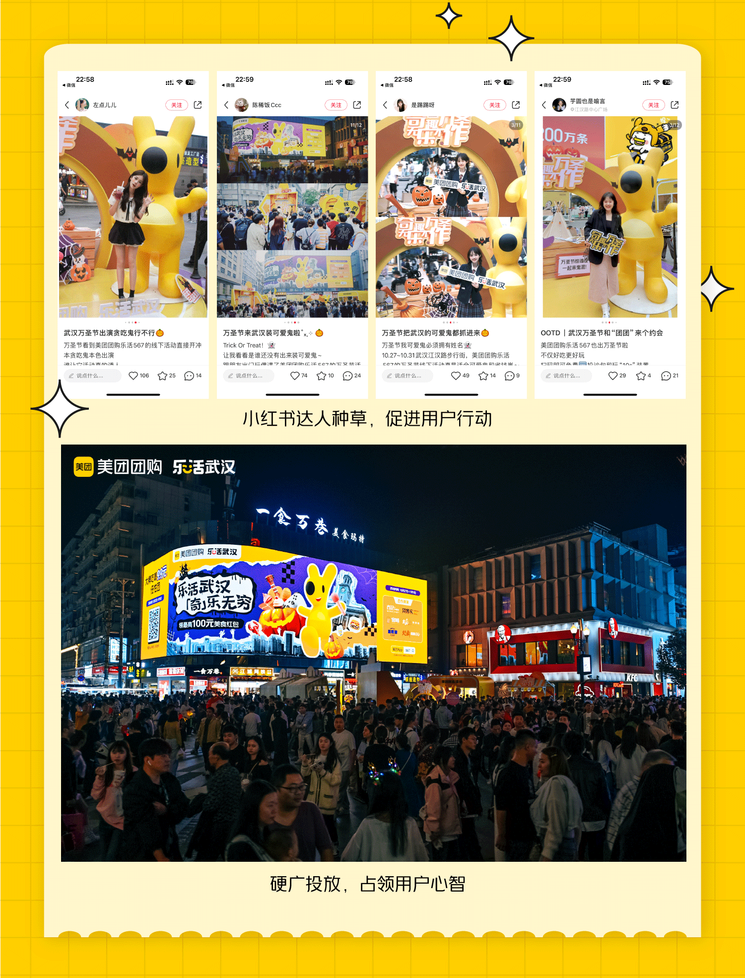 在传播侧,利用微博、微信服务号、小红书等官方账号联动发声,为活动制造了第一波声量;小红书达人、武汉吃喝玩乐微信号、武汉本地社群等传播资源的使用,扩大声量的同时,使用户种草本次活动,促进了行动;美团团购还联合商户,在中心广场LED大屏投放了广告,进一步占领了用户心智。