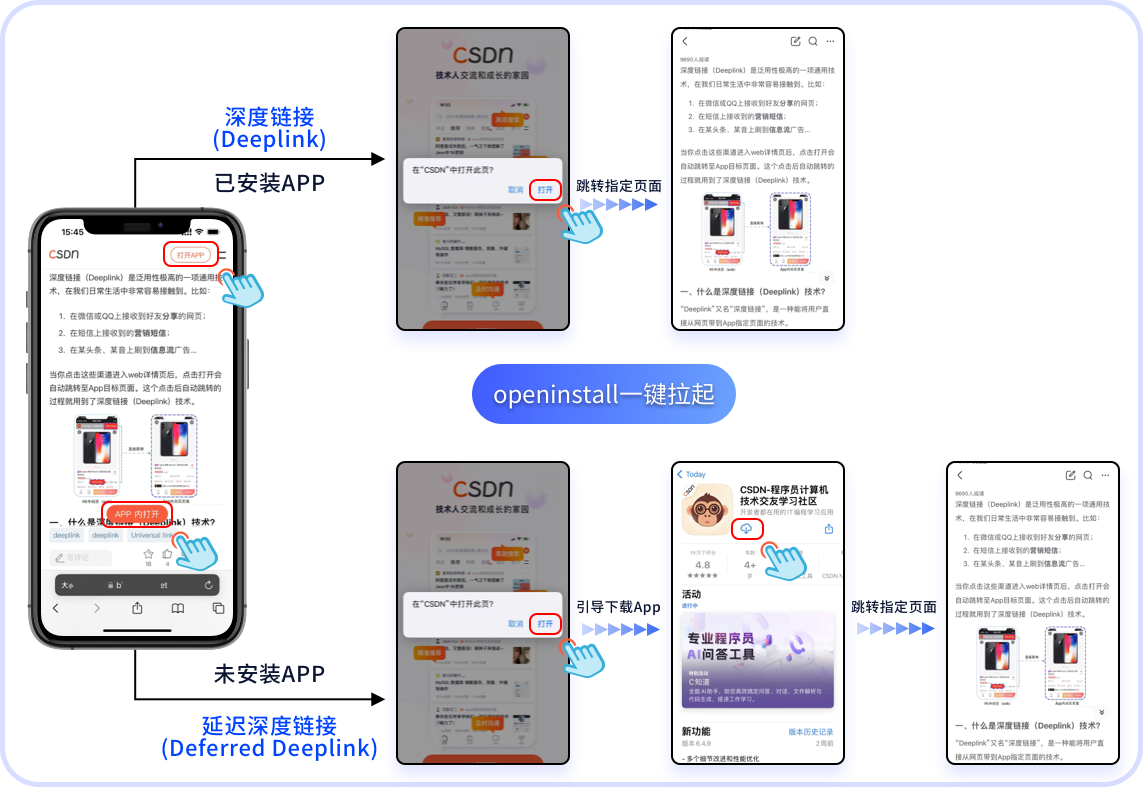延迟深度链接即Deferred Deeplink,是在Deeplink基础上通过在安装过程中传递特定参数实现的升级版功能,能够帮助未安装App的新用户在安装后直达指定页面。openinstall一键拉起方案便打包了两大Deeplink深度链接技术。