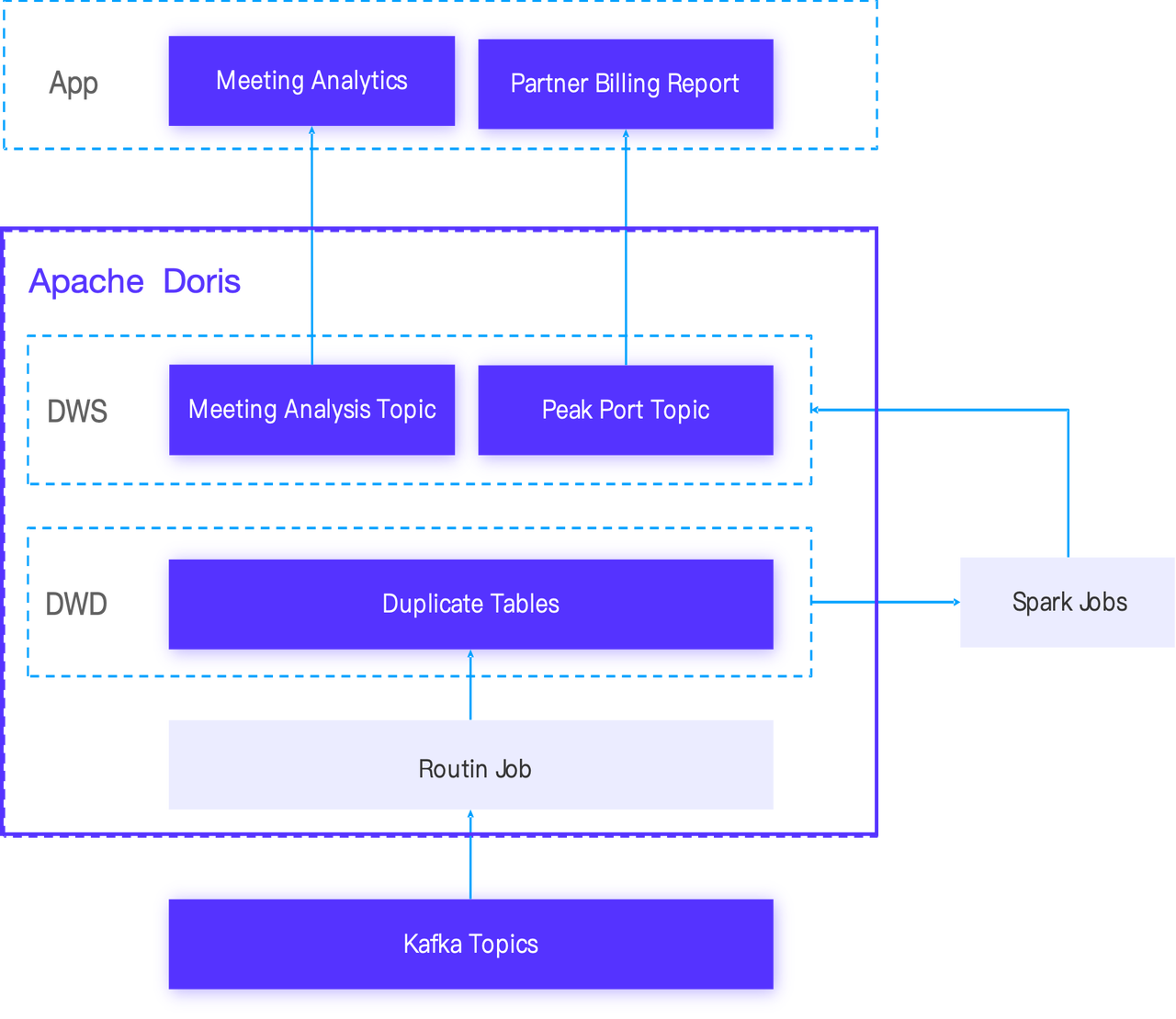 - 接着,通过 Doris 提供的 Doris-Kafka-Connector 插件,通过 Routine Load 可直接将 Kafka Topics 中数据写入 Doris 中,并将数据整合到明细表中构成 DWD 层。