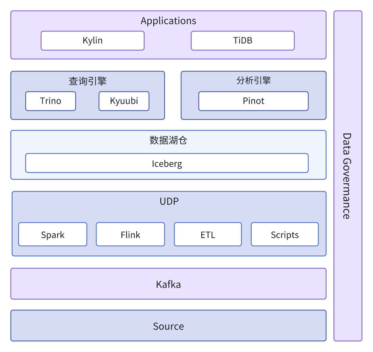 为适配复杂的业务需求,早期架构融合了多种技术栈。数据源通过 Kafka 进行数据抽取,由 UDP 调度系统(Unified Data Platform:调度 ETL/Spark/Flink 等数据处理任务的平台)将数据调度并存储到湖仓层的 Iceberg 中。Trino、Kyuubi 收到查询请求后提供查询服务,Pinot 主要用于 OLAP 分析。