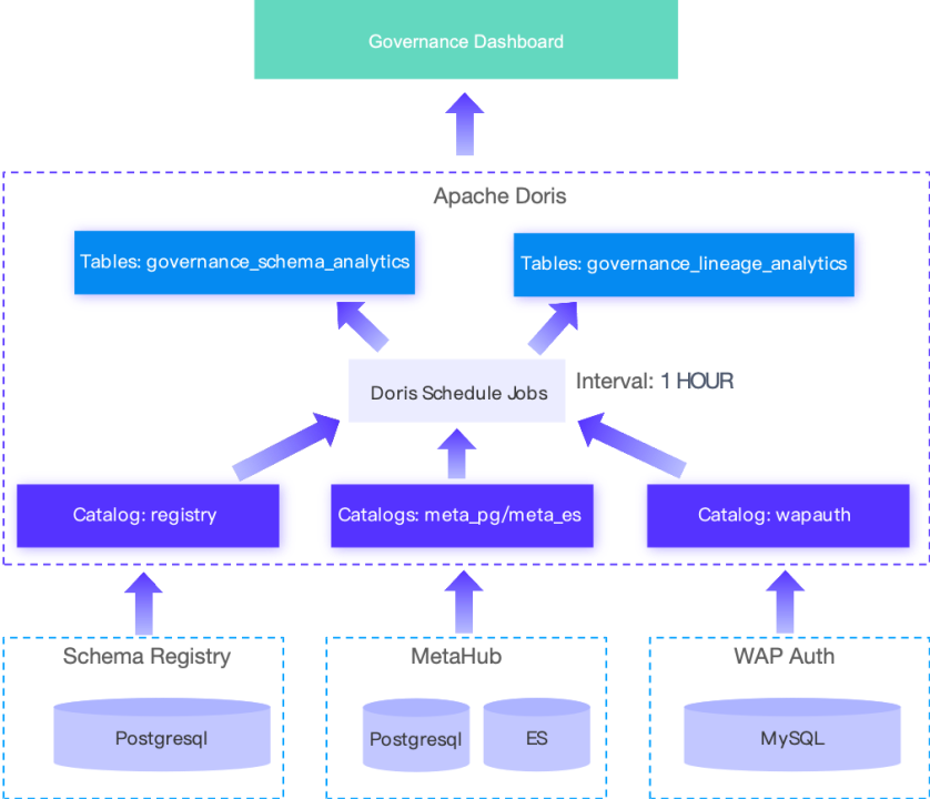 为解决该问题,使用 Doris 替换了 Pinot ,并基于 Doris Multi-Catalog 能力对底层引擎分别建立了 Catalog,使用 Doris 定时任务抽取引擎中数据。抽取的数据被写入上层的主键模型和聚合模型表中。依赖于 Doris SQL 抽取能力以及其提供的数据模型,完全能够满足 Governance Dashboard 的数据需求。