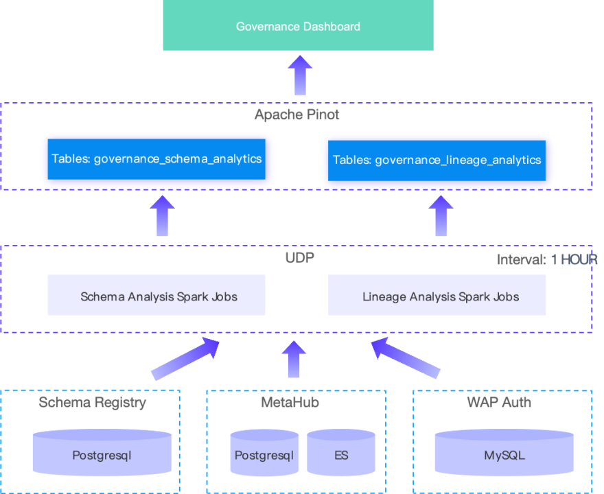 在早期数据治理平台中,依赖 Spark 定期任务提取数据进行 Schema 分析和 Lineage 分析。分析后的结果发送至 Kafka,随后由 Pinot 实时摄取,以便后续的处理展示。这种分散的处理方式可能使得数据治理的整体效率和效果受到限制。不同组件之间的数据交换和同步可能会带来额外的开销和延迟,同时也不利于数据的统一管理和优化。