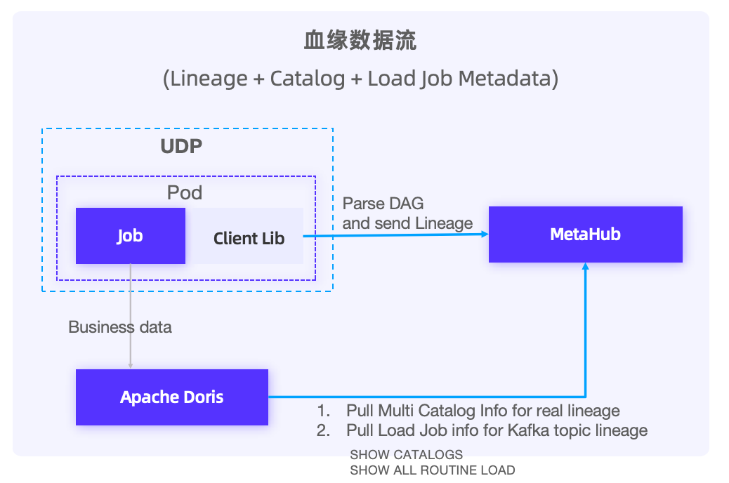- 动态数据血缘生成:当新 Job 读取或写入 Doris 时,生成新的数据血缘关系。为管理动态血缘开发了 Client Library,在平台调度 Job 时,Library 以 Sidecar 的形式注入 Job ,Client Library 解析 Job 的 DAG,并基于此生成数据血缘信息,并将信息发送到 MetaHub。