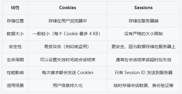 总的来说,Cookies 适合存储小型且需要跨多个会话持久存在的数据,而 Sessions 更适合存储会话级别的数据,确保安全性和性能。