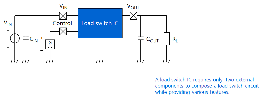 以锂离子或其它类型电池供电的移动设备和节能设备为例。这类电子系统仅通过启用基本电路块,并关闭所有其它电路块来节能。负载开关IC是具有内部开关的电源管理 IC。由于导通电阻和静态电流都很低,因此负载开关IC表现出最小的压降和功耗。负载开关IC集成了各种保护功能,与由分立器件组成的负载开关电路相比,负载开关IC所需的元器件更少。因此,负载开关IC有助于提高电子系统的稳定性并缩小其尺寸。