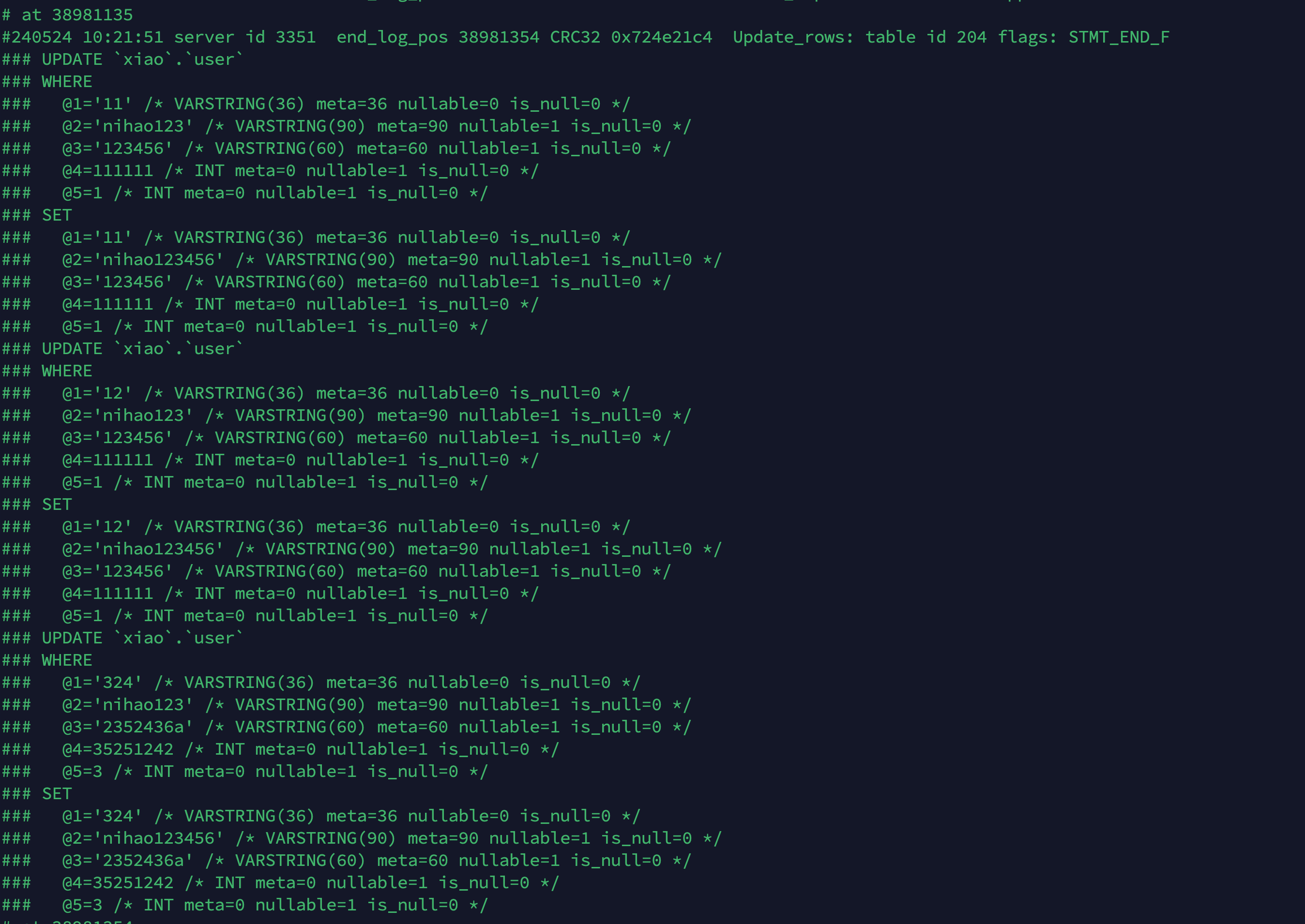mysqlbinlog --start-datetime="2024-05-24 09:52:00" --base64-output=decode-rows -vv mysql_binlog.000004