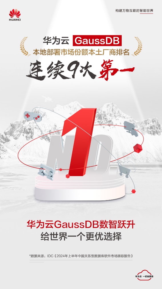 近日,IDC发布《2024年上半年中国关系型数据库软件市场跟踪报告》。报告显示,华为云数据库GaussDB以16.1%的市场份额,位列关系型数据库本地部署模式本土厂商第一名。这也是自2020上半年以来,GaussDB连续九次蝉联第一,持续领跑。