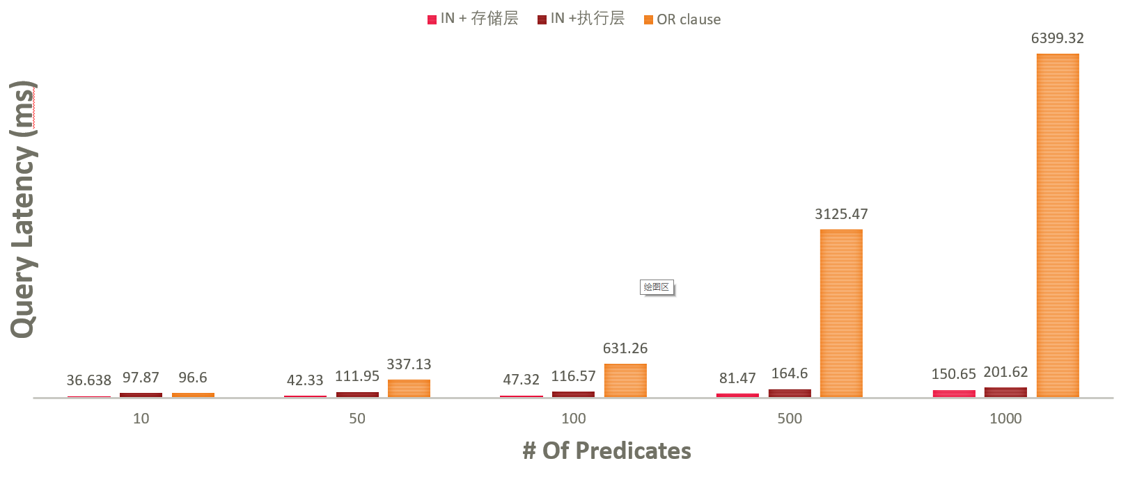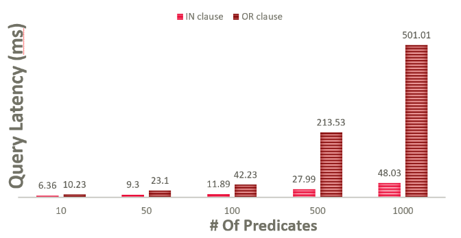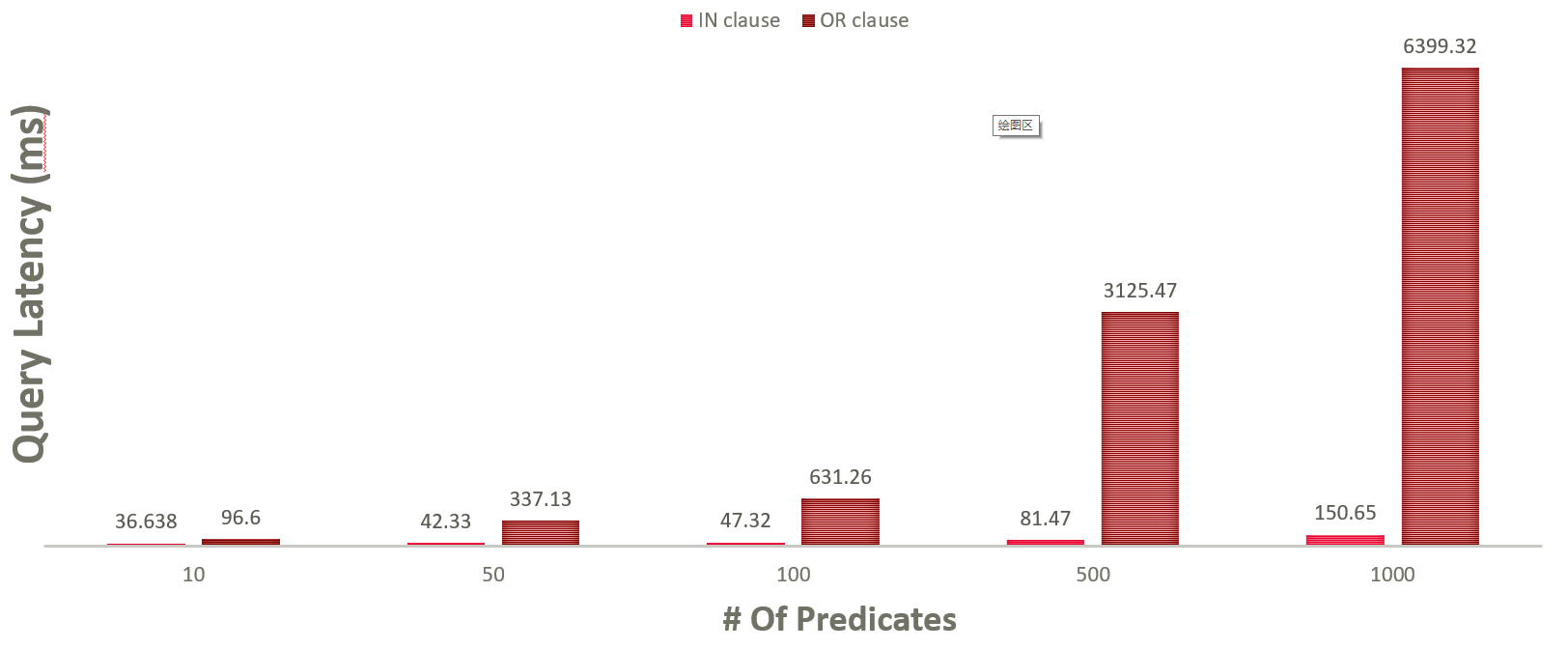 下图显示了性能数据对比。IN表达式的性能依旧优于OR表达式,并且性能差距相比索引属性更大。在谓词个数为1000时,性能差别达到了40倍(150ms vs 6399ms)。