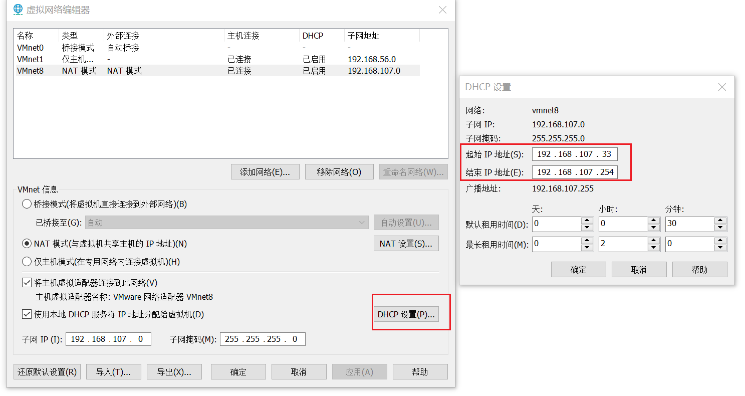 使用 VM ware 的虚拟网络编辑器的DHCP设置,设计相应的IP地址、网关、掩码(使用NAT);也可以设计静态的网络信息(自行搜索)。