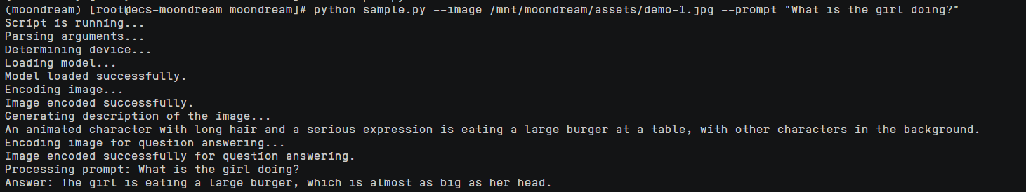 python sample.py --image /mnt/moondream/assets/demo-1.jpg --prompt "What is the girl doing?" #地址改为开发者运行本项目的地址