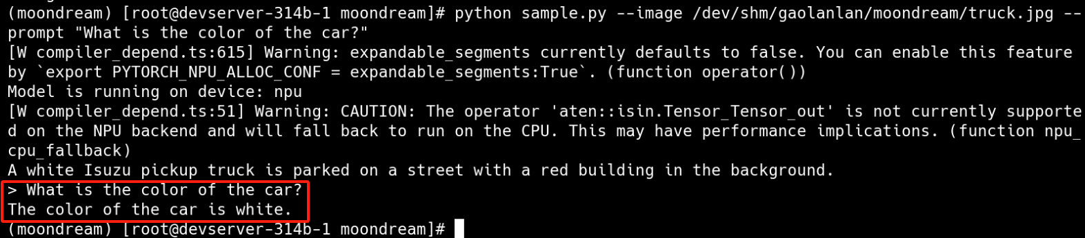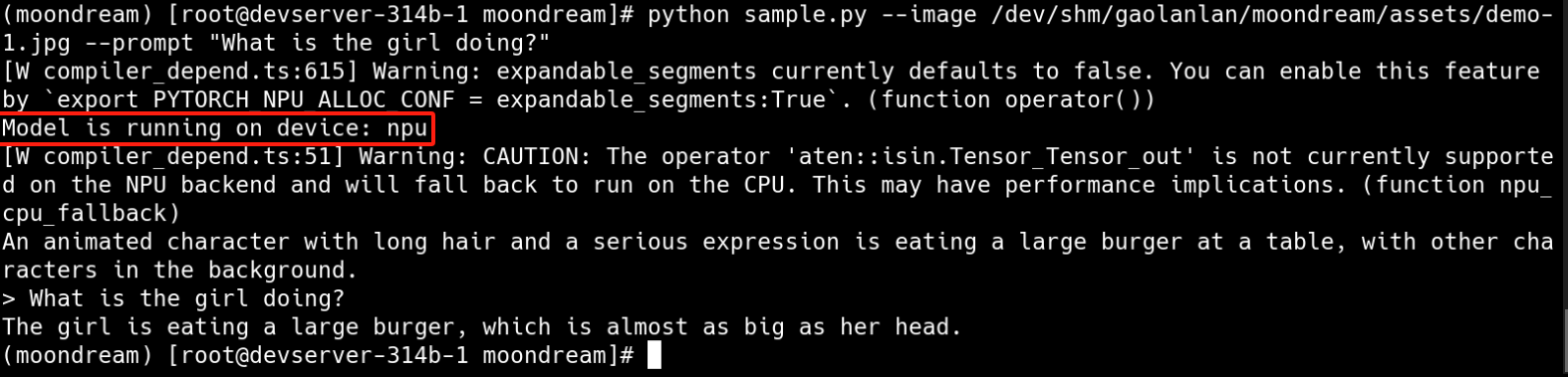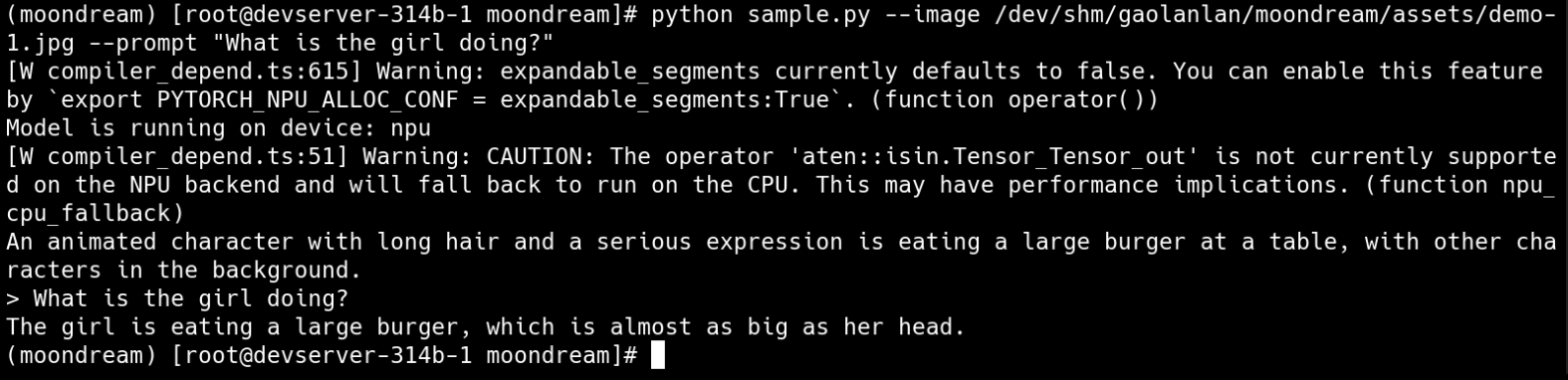 python sample-npu.py --image /mnt/moondream/assets/demo-1.jpg --prompt "What is the girl doing?" #地址改为开发者运行本项目的地址