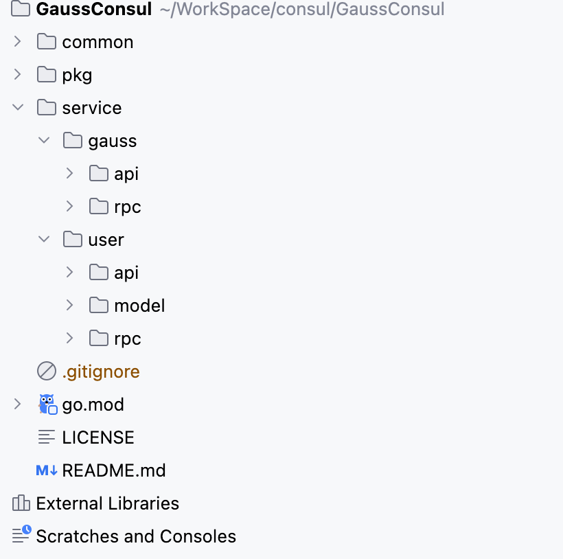 Consul是一个用于服务发现的平台,因此在适配GaussDB前,选择使用 go zero 来开发两个微服务,一个用于与GaussDB数据交互的 user 服务,一个用于给GaussDB做健康检查的 gauss 服务。然后让 Consul 自动发现这两个服务,并注册到 Consul 中。