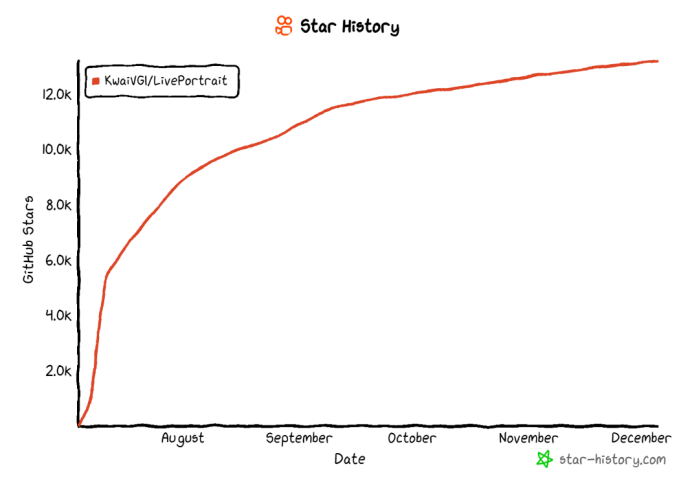 截止到2024年12月5日,LivePortrait在GitHub上的统计数据如下: