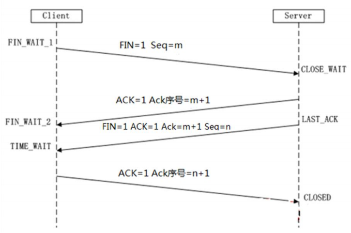 Server,ACK确认序号=n+1,Server进入CLOSED状态,完成四次挥手。