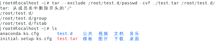 注:--exclude后面只能放一个绝对路径需要跳过的文件,如果有再要跳过的就在后面继续写--exclude。例如:tar --exclude /root/test.d/passwd --exclude /root/test.d/fstab -xvf ./tes.tar /root/test.d/
